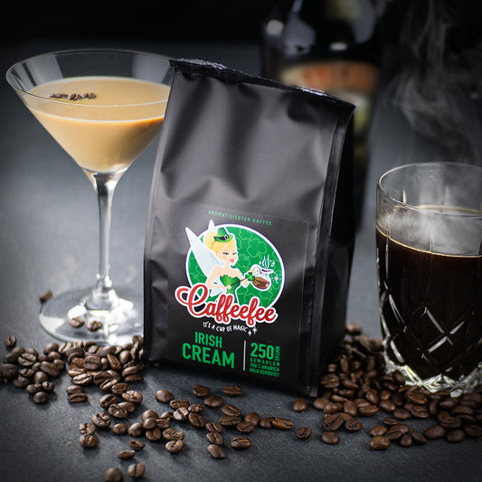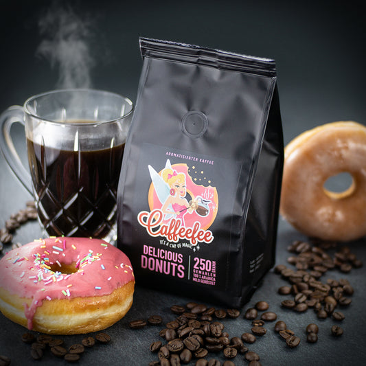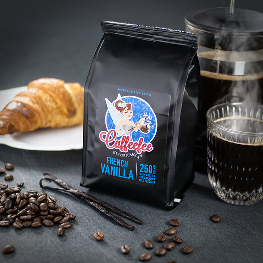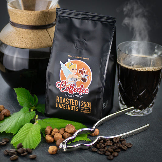 Caffeefee ist ein richtiger Kaffee, erhältlich als ganze Bohnen oder gemahlen. Du bereitest ihn zu wie jeden anderen Filter- oder Bohnenkaffee auch. Die besondere Magie von Caffeefee ist das Aroma – es ist unser "Feenstaub". Kommen die mild gerösteten Kaffeebohnen (100 % Arabica) aus der Rösttrommel, werden sie mit hochwertigen Aromen bestäubt und bescheren Kaffee-Fans so einen ganz neuen Trinkgenuss.